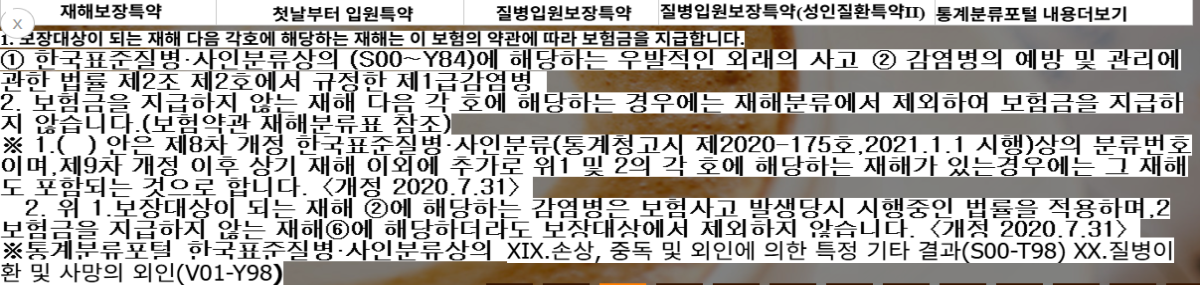한국표준질병·사인분류상의(A00~Y98)에 해당하는 질병 및 재해(위 별표5 질병 및 재해분류표 등 클릭 시 특약확인 가능)  ※ 통계분류포털내용더보기 : 손상,중독 및 외인에 의한 특정 기타 결과(S00-T98),질병이완 및 사망의 외인(V01-Y98) ※무배당 재해보장 특약 ※ 제1조 특약의 체결 및 소멸 이특약의 보험대상자(피보험자)에 대한 보험금 지급사유가 발생할 수있을 때에는 이 특약의 효력은 소멸되지 아니합니다.※보험증권  재해보장 재해로 사망하거나 장해분류표 중 동일한 재해로 여러 신체분위의 합산 장해지급률이 80%이상인 장해상태가 되었을 경우-특약가입금액 재해로 장해분류표에서 정한 장해지급률 중 3%이상 80%미만에 해당하는장해상태가 되었을 경우 특약가입금액*해당 장해지급률- 의무기록지,진단서,후유장해진단서,등 기 제출함 -특약별 누락 건 금융감독원에 민원신청함(재해보장,질병의료특약 등)-1보험금청구 영수증2,보험금 지급설명서3.청구사유별 세부내용(확인 함)-재해보장 특약,질병의료특약 등 특약관련 질병의료특약 질병입원보장 등,진단서(뇌경색),장해진단금,사망보험금,등 미지급.