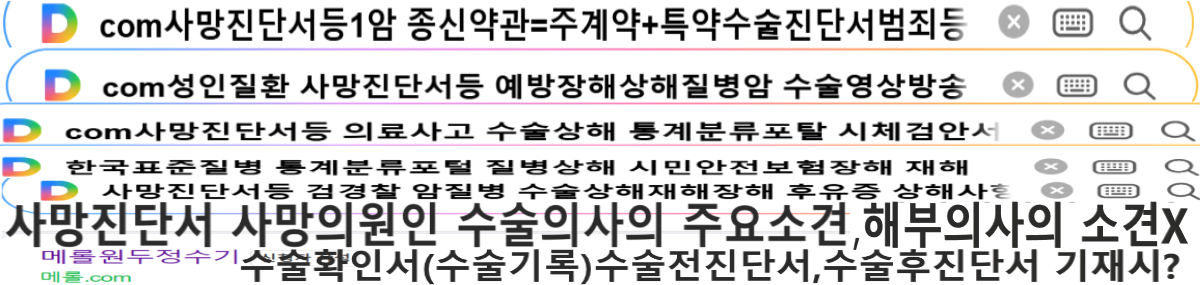 http:://메롤tv.com H.P: 010-6838-4169 네이버tv 홈페이지 광고 네이버TV 금융감독원 "표준약관"검색 질병등 통계분류포털 통계분류포털 내용더보기한국표준질병사인분류(S00~Y84)ⅩⅨ.손상, 중독 및 외인에 의한 특정 기타 결과(S00-T98) ⅩⅩ.질병이환 및 사망의 외인(V01-Y98)손상 중독 의료법시행규칙 [별지제6호] 서식 사망진단서 또는 시체검안서 국가법령정보센터 진단서 수술 장면 촬영요청서