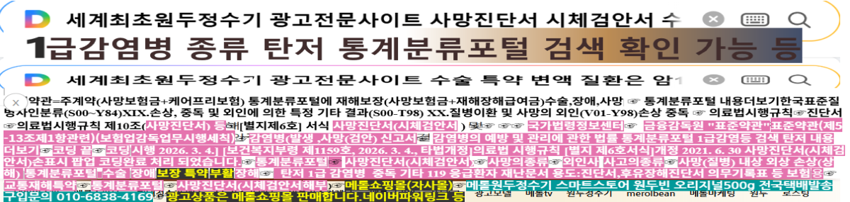 보험약관=주계약(사망보험금+케어프리보험) 통계분류포털에 재해보장(사망보험금+재해장해급여금)수술,장애,사망  통계분류포털 내용더보기한국표준질병사인분류(S00~Y84)ⅩⅨ.손상, 중독 및 외인에 의한 특정 기타 결과(S00-T98) ⅩⅩ.질병이환 및 사망의 외인(V01-Y98)손상 중독  의료법시행규진단서의료법시행규칙 제10조(사망진단서) 등[별지제6호] 서식 사망진단서(시체검안서 )  ☞☞ 국가법령정보센터  금융감독원 "표준약관"표준약관(제5-13조제1항관련)(보험업감독업무시행세칙)감염병(발생 ,사망(검안) 신고서 감염병의 예방 및 관리에 관한 법률 통계분류포 1급감염등 검색 탄저 내용더보코딩 끝코딩시행 2026. 3. 4.] [보건복지부령 제1159호, 2026. 3. 4., 타법개정]의료법 시행규칙 [별지 제6호서식]개정 2021. 6. 30 사망진단서(시체검안서)손표시 팝업 코딩완료 처리 되었습니다.통계분류포털 사망진단서(시체검안서)사망의종류외인사 사고의종류사망(질병) 내상 외상 손상(상해) 통계분류포털 수술 장애보장 특약부활장해  탄저 1급 감염병  중독 기타 119 응급환자 재난문서 용도:진단서,후유장해진단서 의무기록표 등 보험교통재해특약통계분류포털사망진단서(시체검안서해부)메롤쇼핑몰(자사몰)메롤원두정수기 스마트스토어 원두빈 오리지널500g 전국택배발송 구입문의 010-6838-4169광고상품은 메롤쇼핑몰 판매합니다.네이버파워링크 등