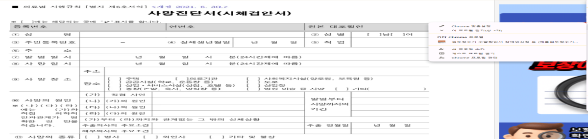 의료법 시행규칙(별지)제6호서식 <개정 2021. 6.30> 사망진단서(시체검안서)보험약관 주계약1.보험금지급기준표 특약중 재해보장 별표1 보험금지급기준표 주계약과 비교확인 등 사망진단서(시체검안서)심장정지 진단서가 없습니다.병원등 문의  응급의료에 관한 법률 시행규칙 ( 약칭: 응급의료법 시행규칙 ) [시행 2025. 3. 11.][보건복지부령 제1096호, 2025. 3. 11., 타법개정]>보험약관 기타재해 119 은급환자 이송서류(구급증명서),병원(산소호흡기 진료비세부내역서)->보험사 서류제출 예정