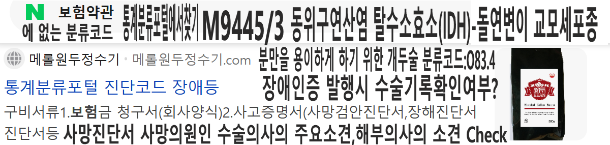 뉴스TV 사망시(의료사고)신고시 출동하지 않는 경찰은?근거자료→통신사 발신전화요청 보험 약출처(무)플러스UP변액연금 제3관 보험금등의 지급(회사의 주된 의무)교통재해특약(장해분류표,재해분류표)공지사항,광고게시판 광고 예정 아래 납입면 약관 참조 등.3.수사기간의조사경찰서방문시 구입서류 준비는?신분증,구급증명원(구급활동일지) 장애가 없슴으로 CHECK 재난번호UZ4181187 (보장대상이 되는 재해→보험약관 통계분류포털에서 IDH 검색진단서(71.9(암코드) C코드입니다. (M994.5/3)?M800~M858)신생물형대분류? 몇급감염병 입니까? (의무기록지에서 의약품처방전 확인M코드에 관련된 치료를 했는지 확인하기)→감염병 및 예방에관한 법률에서 1급감염병,2급감염병,3급감염병을(질병관리청,보건복지부) 관리가 필요하여 질병관리청장이 보건복지부장관과 협의하여 지정하는 감염병을 포함한다 "바이러스 뇌출혈,내상,외상,손상,중독,장애,사망,재해"등 코드가 너무많이 검색인 되고있습니다, 내상하고 외상만 검색해서 표시해도 외인사코드가 나옵니다.출력해서 경찰서 사망진단서,후유장해진단서,제출시 첨부해야 합니까?의사가 신고 하게되어 있습니다. 검색→"질병이환의 외인의사망→사망진단서에 외인사사망 표시하지 않습니다.통계분류포털에서 "수술"검색 수술코드가 있습니다.사망의원인(수술의사의 주요소견,해부학적인 의사의 소견) "외인사 표시를 병사(자연사)로 잘못기재함"진단서 등 허위작성 보험약관(통계분류포털에서 보장대상이되는 재해 찾기입니다) →""재해 장애" (진단서IDH표시됨 C71.9)악성신생물(자연재난,사회재난)→시민안전보험약관 확인? 의무기록지(수술확인서,후유장해진단서,사망진단서(수술확인서 표시없음)등,네이버파워링크,전화번호 광고,영상광고 등6838-4169