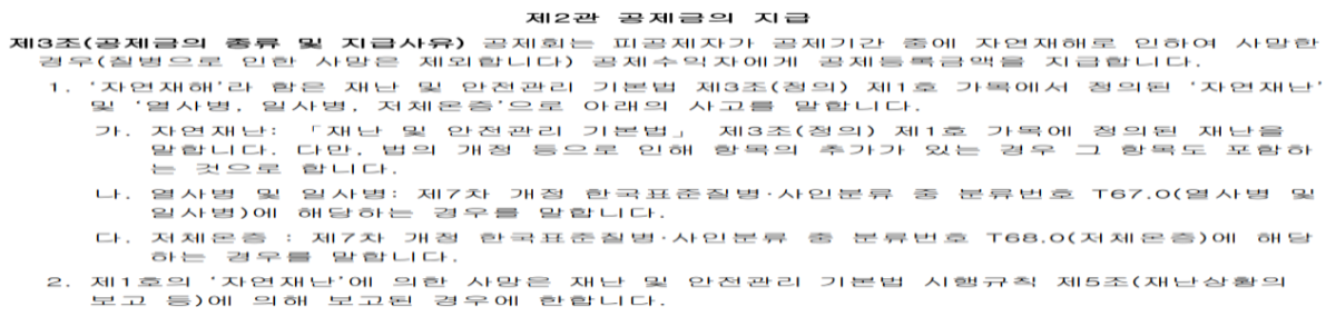 통계청고시(통계분류포털 보건분류 한국표준질병 사인분류 내용더보기(해설서)하단배너 참조)→특약관련 보험금지급설명서가 없습니다. →금감원에4번째(6년째)(특약누락건 수술확인서,후유장해진단서(사고 질병 등)민원신청→1.보험금지급설명서2.청구사유별 세부내용 3보험금청구 영수증(현금) 민원 추가 예정.※특정질병수술보장→암수술자금,4대중증질환(특정뇌질환,특정심질환,특정간,췌장질환,특정폐질환)→진단서등에 용도:보험사 제출용으로 표시되어있습니다.→진단서 와 통계분류포털,보험약관(금감원 뷰어화면 표준약관 상해 약관참조)※암간호특약 [별표1] 보험금지급기준표[별표2] 보험금 지급시의 적용이율[별표3]장해분류표-주계약 [별표3] 과 동일[별표4]재해분류표 주계약 별표7과 동일 [별표5] 대상이 되는 악성신생물 분류표 [기타피부암 및 감상생암 제외] 11.분류번호 C69-C72 눈,뇌 및 충추신경계통의 기타부위의 악성신생물※시민 안전보험약관 상해:공제기간 발생한 급격하고도 우연한 외래의 사고로 신체(의수,의족,의안,의치 등 신체보조장구는 제외하나,인공장기나 부분의치 등 신체에 이식되어 그 기능 을 대신할 경우에는 포함합니다)에 입은 상해를 말합니다.자연재난,자연재해[일사병,열사병]T67.0,[처체온증]T68.0 장해분류표(상해 또는 질병)-⑮자연재해 사망위험 보상제외 특별약관 제1조 (공제금을 지급하지 않는 사유)공제회는 보통약관 제3조 (공제금의 지급사유) 제1호에도 불구하고 자연재해 사망보험금을 보상하지 않습니다.제2조(준용규정) 이 특별약관에 정하지 않은 사항은 보통약관에 따릅니다. |