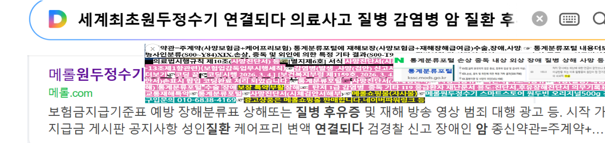 보험약관=주계약(사망보험금+케어프리보험) 통계분류포털에 재해보장(사망보험금+재해장해급여금)수술,장애,사망  통계분류포털 내용더보기한국표준질병사인분류(S00~Y84)ⅩⅨ.손상, 중독 및 외인에 의한 특정 기타 결과(S00-T98) ⅩⅩ.질병이환 및 사망의 외인(V01-Y98)손상 중독  의료법시행규진단서의료법시행규칙 제10조(사망진단서) 등[별지제6호] 서식 사망진단서(시체검안서 )  ☞☞ 국가법령정보센터  금융감독원 "표준약관"표준약관(제5-13조제1항관련)(보험업감독업무시행세칙)감염병(발생 ,사망(검안) 신고서 감염병의 예방 및 관리에 관한 법률 통계분류포 1급감염등 검색 탄저 내용더보코딩 끝코딩시행 2026. 3. 4.] [보건복지부령 제1159호, 2026. 3. 4., 타법개정]의료법 시행규칙 [별지 제6호서식]개정 2021. 6. 30 사망진단서(시체검안서)손표시 팝업 코딩완료 처리 되었습니다.통계분류포털 사망진단서(시체검안서)사망의종류외인사 사고의종류사망(질병) 내상 외상 손상(상해) 통계분류포털 수술 장애보장 특약부활장해  탄저 1급 감염병  중독 기타 119 응급환자 재난문서 용도:진단서,후유장해진단서 의무기록표 등 보험교통재해특약통계분류포털사망진단서(시체검안서해부)메롤쇼핑몰(자사몰)메롤원두정수기 스마트스토어 원두빈 오리지널500g 전국택배발송 구입문의 010-6838-4169광고상품은 메롤쇼핑몰 판매합니다.네이버파워링크 등