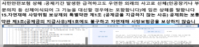 보험사 홈페이지 참조,구비서류안내,장해확인서류,후유장해진단서 사고(질병)발생일로부터 180일 경과 후 청구※2.보험대상자(피보험자)에게 보험기간중 다음 각 목의 사유가 발생하였을 경우(최초사유 발생에 한하여1회한):캐어프리보험금 지급:가."중대한 질병 및 수술 보장개시일" 이후에 중대한질병 으로 진단확정되거나"중대한 수술"을 받았을 경우 나.보장개시일 이후에 "중대한 화상 및 부식"으로진단 확정 되었을 경우※1.보험금지급설명서 2.청구사유별 세부내용 3.보험금청구 영수증→특별약관별 비교하기※별표1.보험금 지급기준표 주계약 보험약관(케어프리보험금+사망보험금)별표1.보험금 지급기준표 비교하기 보험약관 특약별 보장대상이 되는 질병 입원비,진단비,수술확인서,장해분류표,재해분류표 등진단서(질병코드,진단명,처방전)통계청고시(통계분류포털 보건분류 한국표준질병 사인분류 내용더보기(해설서)하단배너 참조)→특약관련 보험금지급설명서가 없습니다. →금감원에4번째(6년째)(특약누락건 수술확인서,후유장해진단서(사고 질병 등)민원신청→1.보험금지급설명서2.청구사유별 세부내용 3보험금청구 영수증(현금) 민원 추가 예정.※특정질병수술보장→암수술자금,4대중증질환(특정뇌질환,특정심질환,특정간,췌장질환,특정폐질환)→진단서등에 용도:보험사 제출용으로 표시되어있습니다.→진단서 와 통계분류포털,보험약관(금감원 뷰어화면 표준약관 상해 약관참조)※암간호특약 [별표1] 보험금지급기준표[별표2] 보험금 지급시의 적용이율[별표3]장해분류표-주계약 [별표3] 과 동일[별표4]재해분류표 주계약 별표7과 동일 [별표5]  대상이 되는 악성신생물 분류표 [기타피부암 및 감상생암 제외] 11.분류번호 C69-C72 눈,뇌 및 충추신경계통의 기타부위의 악성신생물시민 안전보험약관 상해:공제기간 발생한 급격하고도 우연한 외래의 사고로 신체(의수,의족,의안,의치 등 신체보조장구는 제외하나,인공장기나 부분의치 등 신체에 이식되어 그 기능 을 대신할 경우에는 포함합니다)에 입은 상해를 말합니다.자연재난,자연재해[일사병,열사병]T67.0,[처체온증]T68.0 장해분류표(상해 또는 질병)-⑮자연재해 사망위험 보상제외 특별약관 제1조 (공제금을 지급하지 않는 사유)공제회는  보통약관 제3조 (공제금의 지급사유) 제1호에도 불구하고 자연재해 사망보험금을 보상하지 않습니다.제2조(준용규정) 이 특별약관에 정하지 않은 사항은 보통약관에 따릅니다. 1.재난 가.자연재난 나.사회재난  재난안전보험시행규칙 제5조(재난상황의 보고 등)→119(구급일지 재난문서)→