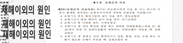 ※금융감독원 검색 표준약관 부표3에서 부표4재해분류표 확인하기 장해분류표 확인하기 해 별표7 재해분류표에서 정하는 재해를 말하며 이하 "재해"라 합니다.로 인하여 사망한 것으로 정부기관이 인정하여 관공서의 사망보고에 따라 가족관계등록부에 기재된 경우에는 그러한 사고가 발생한 때를 사망한 것으로 인정합니다.-질병의료보장특약,재해보장 특약, 재해의료특약 암간호(날짜계산) CI추가보장 특정상병통원특약 ,실손의료보험 보험금 확인 요망 누락 등 보험약관 특약 보험금 지급기준표 참조 사망보험금+재해장해급여금. 주계약 사망보험금+케어프리보험금. ->특약누락건으로 금융감독원 민원신청함.(경찰서나 검찰청확인 후 접수증 받은 후 보험사에 다시보험금 청구예정)-보험약관은 주계약 뒤에 특약별로 나옵니다.(메롤+원두정수기 클릭 공지사항 확인 가능합니다.(통계청의 한국표준질병사인분류의 내용과 금융감독원의 표준약관 부표4 재해분류표의 내용이 다릅니다)-감염병 및 예방에관한 법률 1급 감염병 등 확인하기 통계분류포털(분류내용보기 해설서) 검색 진단명 등 |