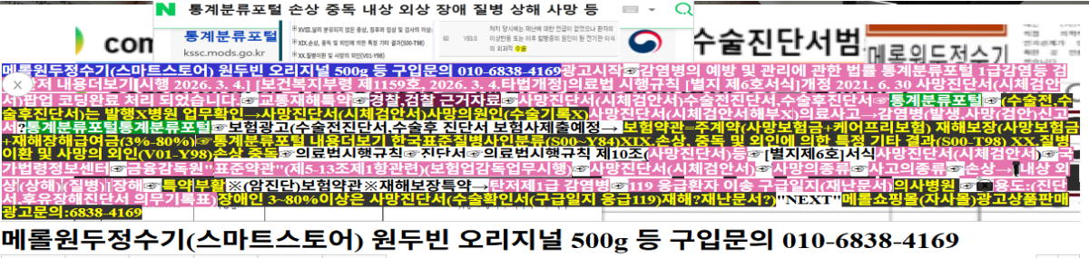 메롤원두정수기(스마트스토어) 원두빈 오리지널 500g 등 구입문의 010-6838-4169광고시작감염병의 예방 및 관리에 관한 법률 통계분류포 1급감염등 검색 탄저 내용더보 시행 2026. 3. 4.] [보건복지부령 제1159호, 2026. 3. 4.타법개정]의료법 시행규칙 [별지 제6호서식]개정 2021. 6. 30 사망진단서(시체검안서)팝업 코딩완료 처리 되었습니다.교통재해특약찰,검찰 근거자료사망진단서(시체검안서)수술전진단서,수술후진단서☞통계분류포털(수술전,수술후진단서)는 발행Ⅹ병원 업무확인→사망진단서(시체검안서)사망의원인(수술기록Ⅹ)사망진단서(시체검안서해부Ⅹ)의료사고→감염병(발생,사망(검안)신고서?통계분류포털통계분류포털☞보험광고(수술전진단서,수술후 진단서 보험사제출예정→ 보험약관=주계약(사망보험금+케어프리보험) 재해보장(사망보험금+재해장해급여금(3%-80%)통계분류포털 내용더보기 한국표준질병사인분류(S00~Y84)ⅩⅨ.손상, 중독 및 외인에 의한 특정 기타 결과(S00-T98) ⅩⅩ.질병이환 및 사망의 외인(V01-Y98)손상 중독의료법시행규진단서의료법시행규칙 제10조(사망진단서)등[별지제6호]서식사망진단서(시체검안서)국가법령정보센터금융감독원"표준약관"(제5-13조제1항관련)(보험업감독업무시행)사망진단서(시체검안서)사망의종류사고의종류손상→[내상 외상(상해)(질병)]장해☞특약부활(암진단)보험약관※재해보장특약→탄저제1급 감염병119 응급환자 이송 구급일지(재난문서)의사병원 용도:(진단서,후유장해진단서 의무기록표)장애인 3~80%이상은 사망진단서(수술확인서(구급일지 응급119)재해?재난문서?)"NEXT"메롤쇼핑몰(자사몰)광고상품판매 광고문의:6838-4169