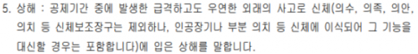 ※ 안전보험약관 상해:공제기간 발생한 급격하고도 우연한 외래의 사고로 신체(의수,의족,의안,의치 등 신체보조장구는 제외하나,인공장기나 부분의치 등 신체에 이식되어 그 기능 을 대신할 경우에는 포함합니다)에 입은 상해를 말합니다. |