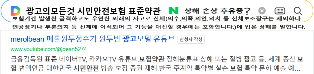 시민안전보험 [상해:공제기간 발생한 급격하고도 우연한 외래의 사고로 신체(의수,의족,의안,의치 등 신체보조장구는 제외하나 인공장기나 부분의치 등 신체에 이식되어 그 기능을 대신할 경우에는 포함합니다.)에 입은 상해를 말합니다. ]생명보험"중대한 질병 암 등"중대한 수술","중대한 화상 및 부식후유장해진단서(상해 또는 질병),수술보장 보험금지급기준표 사망진단서 참조.하단배너 https://www.youtube.com/@bean5274 ,https://smartstore.naver.com/merolbean