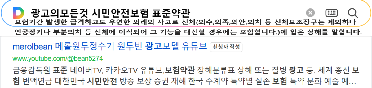 시민안전보험 [상해:공제기간 발생한 급격하고도 우연한 외래의 사고로 신체(의수,의족,의안,의치 등 신체보조장구는 제외하나 인공장기나 부분의치 등 신체에 이식되어 그 기능을 대신할 경우에는 포함합니다.)에 입은 상해를 말합니다. ]생명보험"중대한 질병 암 등"중대한 수술","중대한 화상 및 부식후유장해진단서(상해 또는 질병),수술보장 보험금지급기준표 사망진단서 참조.하단배너 https://www.youtube.com/@bean5274 ,https://smartstore.naver.com/merolbean