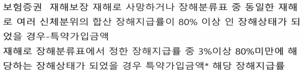 보험증권 재해보장 재해로 사망하거나 장해분류표 중 동일한 재해로 여러 신체분위의 합산 장해지급률이 80% 이상 인 장해상태가 되었을 경우-특약가입금액 재해로 장해분류표에서 정한 장해지급률 중 3%이상 80%미만에 해당하는 장해상태가 되었을 경우 특약가입금액* 해당 장해지급률